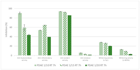 Figure 6. Effect of the plant/PG ratio on the resulting extracts’ bioactivities (plant/PG ratios of 1/10, 1/15 and 1/20 (w/w) respectively, with maceration performed at RT for 7 h).