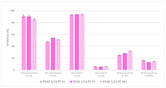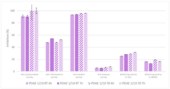 Figure 8. Effect of the maceration temperature on the resulting extracts’ bioactivities (plant/PG ratio 1/10 (w/w), with maceration performed for either 4 h or 7 h, at RT or 70 °C, respectively).