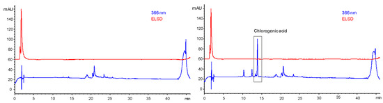 SPE effluent’s composition after load of the cartridge using respectively 1.5 (left) and 3 mL (right) of the ingredient, monitored using HPLC analysis at 366 nm (blue signal) and with ELSD (red signal).