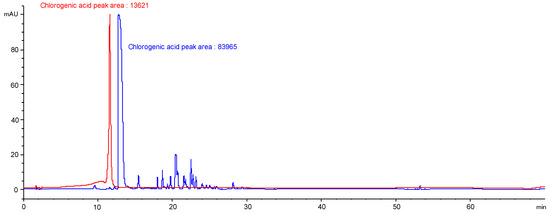 Determination of the chlorogenic acid peak area monitored by HPLC analysis at 366 nm: solution of chlorogenic acid in MeOH (red signal) and PG ingredient diluted in water (1/3) and supplemented with chlorogenic acid (blue signal). The artificial shift between both chlorogenic acid peaks eases the reading of the figure.