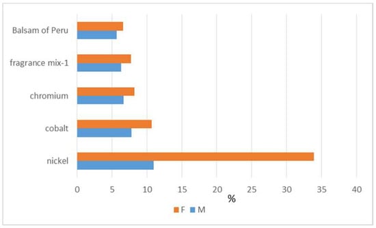 Figure 1 reports the percentages of sensitization to the top-five sensitizers in our group—fragrance mix-1 sensitization was found in 6.3% and 7.7% of men and women (p < 0.05), respectively, and this hapten was fourth after nickel, cobalt, and chromium sensitization.