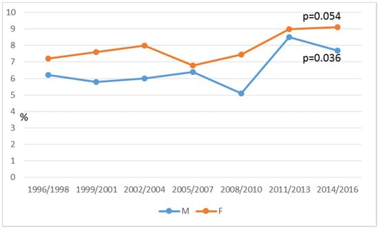 The temporal analysis for fragrance mix-1 sensitization showed a significant increasing trend (Table 2 and Figure 2) from 8.1% to 9.6% in males and from 9% to 13.4% in females with more than 65 years, in 1996–1998 and 2014–2016, respectively.