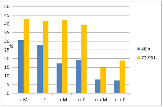 Patch test results, in detail, are reported in Figure 3—55.9% of male and 54.6% of female patients reacted at 48 h (D2), mainly with “+” reactions (30.7% in male and 27.8% in female patients), while the reading at 72 or 96 h (D3/D4) was 42.9% in males and 41.7% in female patients as “++”. Women presented with a significantly higher percentage of very strong reactions (“+++”), in 18.9% of cases, with respect of 14.9% of male patients (p < 0.05).