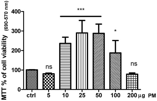 Cell viability was determined by the MTT assay, measuring the reduction of 3-(4,5-dimethylthiasol-2-yl)-2,4,-diphenyltetrazolium bromide (MTT) by mitochondrial succinate dehydrogenase, as previously described [12]. The MTT enters the cells and passes into the mitochondria where it is reduced to an insoluble, colored, formazan product. The amount of color produced is directly proportional to the number of viable cells. HaCat cells were incubated with a different amount of PM (from 0 to 200 µg) in 96-well-plates for 24 h. At the time of assay, MTT (10 μL, 5 mg/mL in PBS) was added to each well and incubated for 3 h at 37 °C. The medium was then carefully aspirated, and DMSO (100 μL) was added to solubilize the colored formazan product, agitating the plates for 5 min on a shaker. The absorbance of each well was measured with a microtiter plate reader (Synergy H1 by BioTeck). The optical density (OD) was calculated as the difference between the absorbance at the reference wavelength (690 nm) and the absorbance at the test wavelength (570 nm). Percent viability was calculated as (OD of treated sample/OD of control) ×100.