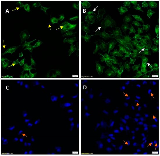 Cytoskeletal remodeling and keratinocytes terminal differentiation are markers of skin regeneration [18]. In this view, evaluation of cell morphology was assessed by fluorescence microscopy. Change in cell morphology gaging cytoskeletal remodeling and nuclear lobe formation was tested by phalloidin-stained F-actin and DAPI, respectively. In Figure 2, keratinocytes cultured without (Panel A) and with PM (Panel B) cytoskeletal remodeling was observed. The yellow arrows in Figure 2 panel A indicate that the F actin filaments show a centromedian cellular localization. In the presence of PM for 24 h, the isoform F of the actin show a cortical localization near to the plasma membrane as indicated with the white arrows (Panel B). Terminal differentiation of keratinocytes was assessed by changes in nuclear morphology. The lobed (half-moon) nucleus are typical of terminal differentiation. In the presence of PM for 24 h, a significant number of lobed nuclei are shown by orange arrows (Panel D) compared to the control (Panel C). Indeed, in our set of experiments PM induced a re-localization of isoform F of the actin near to the plasma membrane as well as lobed (half-moon) nucleus shape typical of terminal differentiation.
