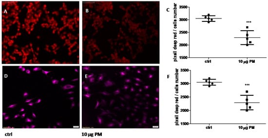 Therefore, we further evaluated the intracellular reactive oxygen species (intROS) formation, treating keratinocytes for 6 h with 10 µg of PM and then exposing the cellular layer to H2O2 500 µM for 30 min. The specific dye CellRox Deep Red revealed that PM significantly decreased intROS formation, as shown in Figure 3 Panel E, compared to the control counterpart (Panel D), suggesting a potent scavenging action of PM. In Panel F, a graph box plot of deep-red dots pixel analysis (*** P = 0.0002) is shown.
