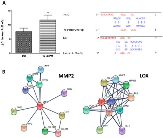 PM induce hsa-miR29-3p expression (A) has-miR-29a-3p expression without and with PM and its mRNAs interaction. (B) String data protein MMP2 and LOX interactions.