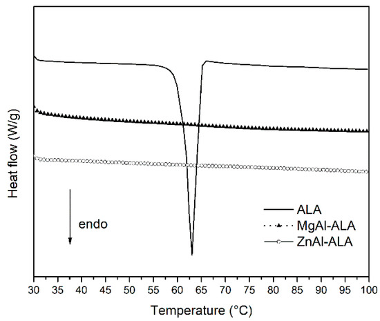 The intercalation of ALA into HTlc galleries allows to obtain a final product in which the active ingredient is no longer in crystalline form. This was confirmed submitting crystalline ALA and the intercalation products MgAl-ALA and ZnAl-ALA to differential scanning calorimetry analysis. In the thermogram of crystalline ALA reported in Figure 1 it is clearly visible a sharp endothermic peak at 66 °C (ΔH = −136.17 J/g) corresponding to the melting, following the degradation of the compound [44], while the peak relative to melting point disappears in the case of both intercalation products (Figure 1).