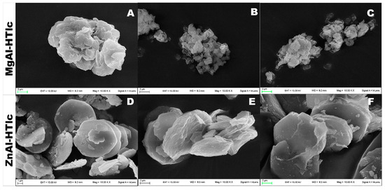 SEM micrographs of: (A) MgAl-Cl; (B,C) MgAl-ALA; (D) ZnAl-Cl; and (E,F) ZnAl-ALA.