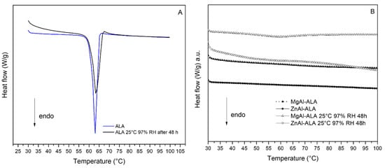 Thermograms obtained before and after storage at 25 °C for 48 h 97% RH of: (A) crystalline ALA; (B) MgAl-ALA and ZnAl-ALA, the spectra (B) are shown in arbitrary units (a.u.) and shifted for clarity.