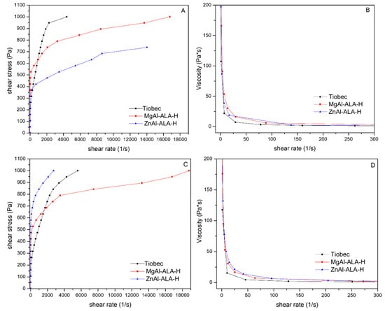 On the other hand, in the case of ZnAl-ALA-H a decrease of flowing was observed (shear rate range 0.05–2.72·103 1/s) compared to 25 °C (Figure 4B).