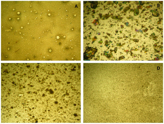 Pictures obtained using an optical microscope: (A) Tiobec®; (B) ALA-H; (C) MgAl-ALA-H, and (D) ZnAl-ALA.