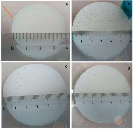 In the case of hydrogels containing the hybrids, a highest spread diameter was measured: 58 mm for MgAl-ALA-H (Figure 6C) and 62 mm ZnAl-ALA-H (Figure 6D). These values identify the developed hydrogels as semifluid [35,36].
