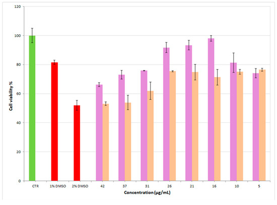 Effect on primary dermal fibroblasts viability incubated with different concentrations of supernatants (diluted with DMEM) deriving from the contact between MgAl-ALA (pink bars) or ZnAl-ALA (orange bars) and DMEM (n = 3, ± SD). DMEM was used as negative control (CTR with 100% of cell viability) and DMSO, known to induce cell death, used as a positive control with two different concentrations.