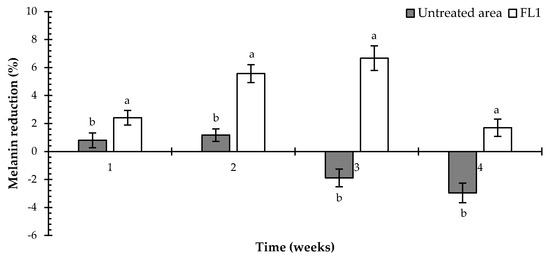 | Untreated area | Melanin content (%) | 36.44 ± 0.37 a | 36.15 ± 0.34 a | 36.01 ± 0.34 a | 37.13 ± 0.39 ab | 37.52 ± 0.47 b |