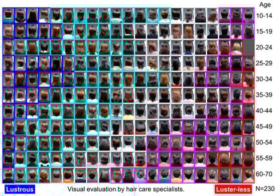 Variation and distribution of hair appearance (hair luster) in 230 Japanese panelists (female, aged 10–70). Hair luster was visually evaluated in five steps from luster-less to lustrous, by three hair care specialists (one hair stylist and two hair scientists), under constant lighting conditions just after shampooing followed by hair drying. “Luster-less” is shown in red, “somewhat luster-less” is pink, “in-between” is white, “somewhat lustrous” is sky blue, and “lustrous” is blue, in this picture.