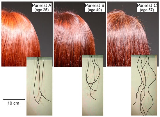 In order to investigate the reason for the change in hair luster accompanied with age, the hair was observed in detail. The enlarged photographs of three typical examples of panelists of 25, 40, and 57 years old are shown in Figure 3. The photograph of hair fibers sampled from each panelist is also shown in the figure. Panelist A (aged 25) has more straight hair fibers and shows aligned multiple hair fibers, which have almost synchronized orientation along hair length, and, therefore, relatively sharp luster can be observed. Hair fibers sampled from older panelists become more meandering, and, therefore, the alignment of multiple hair fibers becomes less-synchronized along the hair length. This is probably the reason why hair appearance becomes luster-less.