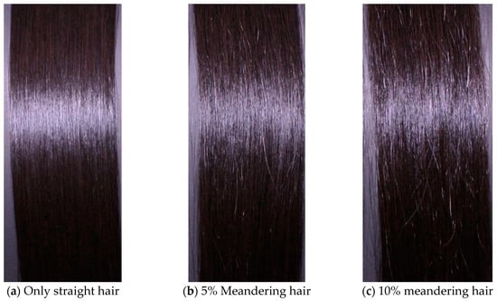 Figure 4 shows the appearances of hair bundles of only straight hair, of 5% meandering hair in the straight hair, and of 10% meandering hair [24]. Hair alignment and appearance are clearly changed by adding meandering fibers. The above results of hair observations show that the alignment of multiple hair fibers is an important factor to control hair appearance.