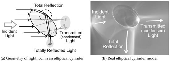 Light reflection and refraction behaviors. (a) Shows the geometry of light loci in an elliptical cylinder, calculated with assumptions, in which ellipticity (minor/major axes) is 0.5 and the refractive index of the cylinder is 1.50. (b) Shows the light reflection and refraction behaviors of real elliptical cylinder model made of acryl resin (ellipticity is 0.7, refractive index is ca. 1.51). This figure is quoted and revised from the references [13,15].