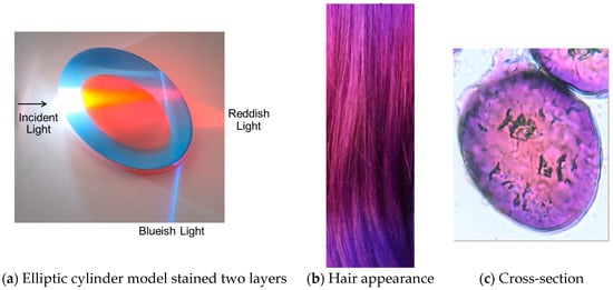 The total reflection light passes relatively outer region of hair fiber as shown in Figure 5, and, therefore, the apparent color of the light is affected by the color of the outer region. Based on this phenomenon, an interesting technology has been proposed [30]. When the outer and inner regions in hair fiber are stained with different colors, such as blue and red as shown in the model in Figure 6a, the total reflection light passes almost only the outer region, and the color of the totally reflected light is observed as blueish and normally transmitted light reflects both inner reddish and outer blueish colors.