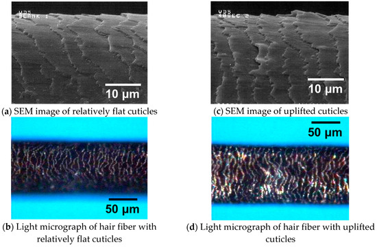 Micrographs of hair fibers with relatively flat and uplifted cuticles, those were taken by a scanning electron microscopy (SEM) and light microscopy. (a,b) are SEM image and light micrograph of hair fiber with relatively flat cuticle, and (c,d) are those of hair fiber with uplifted cuticles. In the light microscopy, any mounting medium was not used to observe light scattering under ambient conditions. Those figures are quoted and revised from the references [15,21].