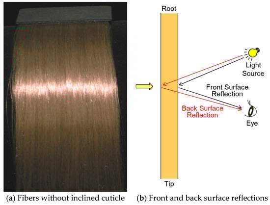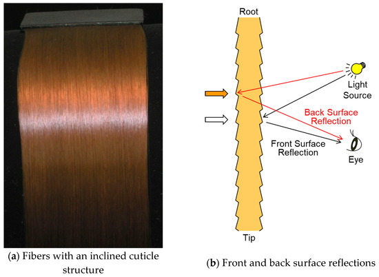 The effect of hair structures on hair appearance, especially on hair luster, has been studied by many scientists [1,2,3,4,5,6,7,8,9,10,11,12,13,14,15,16,17,18,19,20,21,22]. Initial approaches have been focused on the effect of the cuticle structure in many cases, because the cuticle is located on the outermost surface of hair fiber and has been reasonably considered as the most important factor for the reflection [5,6,7,8]. Some oils and/or polymers have also been used to enhance light reflection at the hair surface and to improve hair luster [7,8]. On the other hand, the effect of hair internal structure on hair appearance has been studied by various research groups [9,10,11,12,13,14,15,16]. This effect of internal structure is considered as smaller than the effect of surface cuticles, in the case of dark colored hair, while the effect of internal structure is more significant and not negligible, in the case of lighter colored hair.