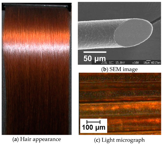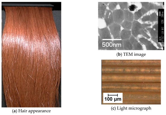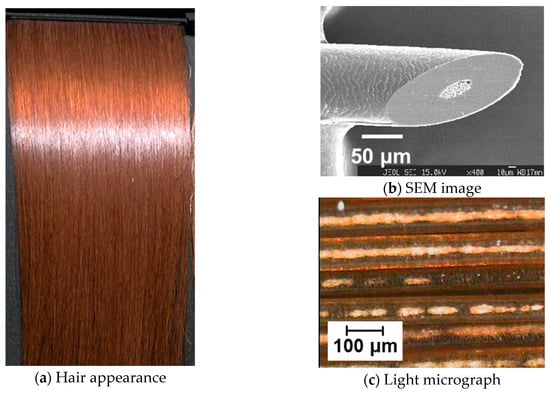 Hair appearance and the corresponding micrographs of the hair, which shows micro-pores in the cortex. (a) is hair appearance, (b,c) is transmission electron micrograph (TEM) and light micrograph for corresponding hair fibers. In light microscopy, any mounting medium was not used to observe light scattering under ambient conditions. These pictures are quoted and revised from the references [15,21].