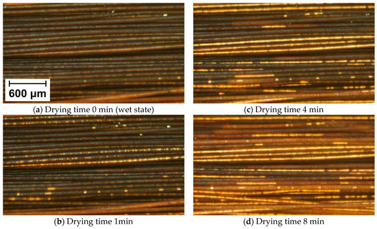 Interestingly, the light scattering at the porous structure of the medulla is reversibly changed from more- to less-scattered states by the swelling of the hair fiber from dry to wet states in water, and from less- to more-scattered states by drying from wet to dry states again. Those reversible changes from less- to more-scattered states are shown in Figure 13 according to the drying time from 0 to 8 min with a hot dryer. The bright lines of light scattering at the porous medulla in hair fibers are rarely observed or slightly observed at 0 min (under wet condition), but the bright lines gradually increase with drying time, as shown in the figures.