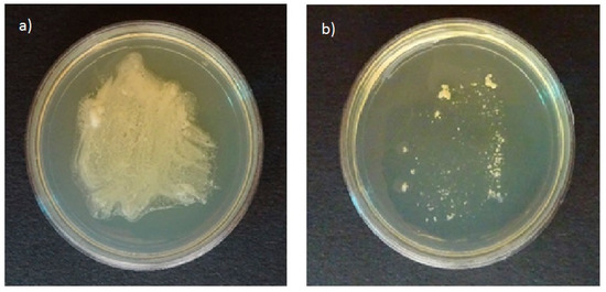 All tested strains of Malassezia species grown on plates of agar selective for pathogenic fungi in the presence of olive oil resulted in growth of white colonies on the plates (Figure 1a). In contrast, no growth was found on the agar plates selective for pathogenic fungi without olive oil (Figure 1b). The ability to use olive oil as an external lipid source was reported by Mayser et al. [17]. Thus, agar selective for pathogenic fungi can be used to study the ability of Malassezia species to assimilate cosmetic ingredients.