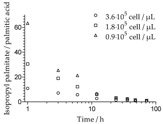 The hydrolysis rate of isopropyl palmitate and its relationship to cell number for M. sympodialis was investigated. The results, expressed as the isopropyl palmitate to palmitic acid ratio, are shown in Figure 2. It was observed that with a higher number of cells present, a larger portion of isopropyl palmitate was hydrolyzed, suggesting that the hydrolysis rate of isopropyl palmitate was proportional to cell number. An almost linear decrease of isopropyl palmitate was observed over the incubation time. After 72 h, independent of the initial cell number, about 40% of the initial concentration of isopropyl palmitate remained. However, the amount of palmitic acid produced as a result of hydrolysis was lower than expected. A longer incubation time resulted in a relatively lower concentration of palmitic acid. Accordingly, the isopropyl palmitate to palmitic acid ratio was not constant over time.