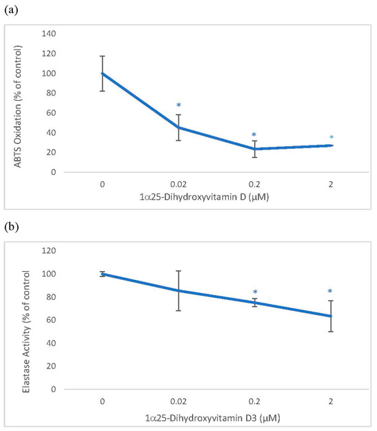 Vitamin D was directly inhibitory to ABTS oxidation and elastase activity. Vitamin D at 0.02, 0.2 and 2 µM significantly inhibited ABTS oxidation to 45%, 24%, and 27% of the control, and at 0.2 and 2 µM, it significantly inhibited elastase activity to 75% and 63% of the control (p < 0.05) (Figure 1).