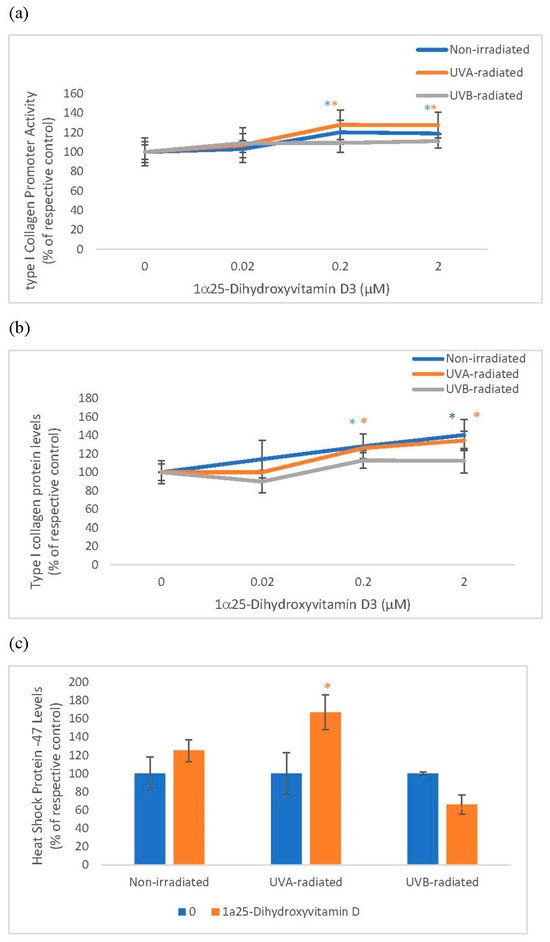 Vitamin D significantly and similarly stimulated collagen expression at promoter and protein levels in non-irradiated and UVA-radiated fibroblasts but not in UVB-radiated fibroblasts (Figure 2). Vitamin D significantly stimulated HSP-47 in UVA-radiated fibroblasts but not in non-radiated and UVB-radiated fibroblasts (Figure 2). UVA and UVB-radiation significantly inhibited collagen expression at promoter and protein levels, and UVA-radiation significantly inhibited HSP-47 in fibroblasts, as previously reported [3,12].