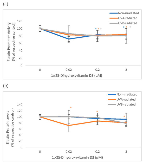 Vitamin D significantly and similarly inhibited elastin promoter activity in non-irradiated and UV-radiated fibroblasts and inhibited elastin protein levels in UVA radiated fibroblasts (Figure 3). Vitamin D significantly inhibited elastase activity in non-radiated and UVA-radiated fibroblasts but not in UVB-radiated fibroblasts (Figure 3). UVA-radiation significantly stimulated elastin expression at promoter and protein levels, and UVB-radiation significantly inhibited elastin expression at promoter and protein levels in fibroblasts, as previously reported [1,14,16]. UV radiation did not significantly alter elastase activity in dermal fibroblasts (data not shown).
