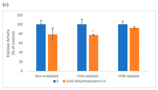 Relative to the respective controls (100%), vitamin D at 0.2 and 2 µM significantly inhibited elastin promoter activity to around 80% in non-irradiated, UVA-radiated, and UVB-radiated fibroblasts (p < 0.05) (Figure 3a). Relative to UVA-radiated control (100%), vitamin D at 0.02, 0.2, and 2 µM significantly inhibited elastin protein levels to 72%, 87%, and 81% in UVA-radiated fibroblasts (p < 0.05) (Figure 3b). Relative to the respective controls, vitamin D at 0.2 µM inhibited elastase activity to 79% in non-irradiated fibroblasts, and to 77% in the UVA-radiated control (p < 0.05) (Figure 3c).