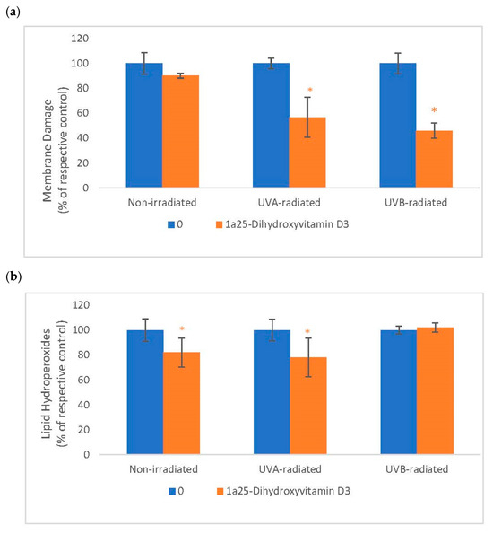 Relative to respective controls (100%), vitamin D at 0.2 µM significantly inhibited membrane damage to 57% and 46%, respectively, in UVA-radiated and UVB-radiated fibroblasts (p < 0.05) (Figure 5a). Relative to respective controls (100%), vitamin D at 0.2 µM significantly inhibited lipid peroxidation to 82% and 78%, respectively, in non-irradiated and UVA-radiated fibroblasts (p < 0.05) (Figure 5a).