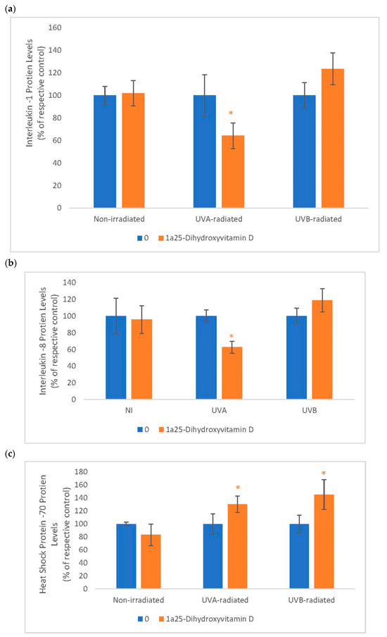 In UVA-radiated cells, vitamin D at 0.2 µM inhibited IL-1 and IL-8 protein levels to 64% and 63% of the UVA-radiated control, respectively (p < 0.05) (Figure 6a). Relative to the respective controls (100%), vitamin D at 0.2 µM significantly stimulated HSP-70 to 130% and 145% in UVA-radiated and UVB-radiated fibroblasts, respectively (p < 0.05) (Figure 6b).