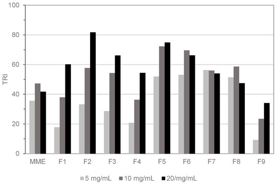 The commercial oleo-gum of myrrh was extracted in methanol followed by solvent evaporation to obtain MME. The TLC fingerprint of MME was characterized by the presence of multiple non-polar compounds. Therefore, the total extract was fractionated by DCVC using a low-polarity gradient of hexane/ethyl acetate. Nine major fractions (F1–F9) were obtained and tested in the HTS-DCYA assay along with the crude extract. The reactivity of the whole extract was below a TRI of 50 at any tested concentration (Figure 1), whereas all fractions scored a TRI between 34 and 82 at 20 mg/mL. A concentration-dependent increase in fluorescence response (TRI) was obtained for fractions F1–F5 and, to a minor extent, for the polar fraction F9. Qualitative evaluation of the crude extract profile by TLC showed the presence of multiple fluorescent spots after reaction with DCYA, mainly in fractions F2–F4. The remaining fractions were also positive in the fluorescence assay, but no clear, evident fluorescent adduct(s) was identified by qualitative TLC experiments.