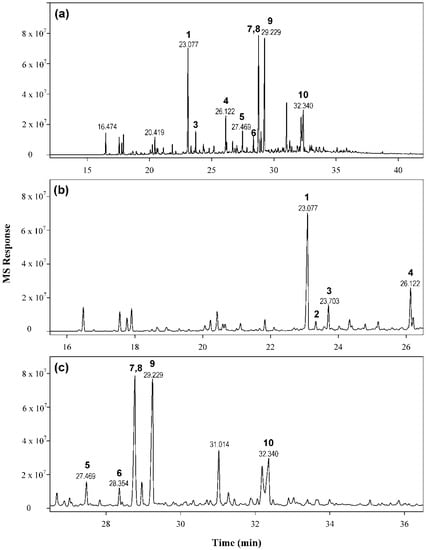Gas chromatographic analyses were conducted using an Agilent 7890A GC system equipped with a 5975C quadrupole mass spectrometer and a 7693 autosampler (Agilent Technologies, Santa Clara, CA, USA). The separation was performed on a DB-5MS capillary column (Agilent J&W Scientific, Folsom, CA, USA) with dimensions of 30 m × 0.25 mm i.d. × 0.25 µm film thickness. The MME was diluted to 5 mg/mL in HPLC-plus-grade acetone (>99.9%, Sigma-Aldrich), and 0.5 µL of the sample solution was injected. Helium was used as the carrier gas at a flow rate of 1 mL/min. The inlet temperature was set to 260 °C with a split injection at the split ratio of 30:1. The oven temperature program was as follows: the temperature was initially 60 °C (held for 2 min), increased to 280 °C at a rate of 5.0 °C /min, and isothermal for 10 min at 280 °C. Mass spectra were recorded from m/z 40 to 500 amu in scan mode with the electron ionization (EI) source at 70 eV. The ion source and quadrupole temperatures were 230 °C and 150 °C, respectively. Data acquisition was performed using an Agilent MSD Chemstation (F.01.03.2357). Agilent MassHunter Qualitative Analysis and Quantitative Analysis (version B.07.00) were used for data analysis. Peak identity was confirmed with available standards, and the NIST database (version 2.2) was used for tentative compound identification.