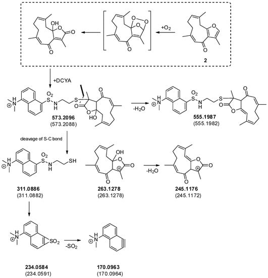 In order to confirm whether the increased fluorescence response was related to the formation of covalent fluorescent adduct(s), the reaction of 2 with DCYA was analyzed by HPLC-DAD-MS as an example. The comparison of control chromatograms with the reaction enabled the identification of a newly formed peak (rt 10.5 min) having m/z 573 (ESI+). The calculated mass was compatible with a dioxygenated analog of a DCYA adduct with furanodienone 2. Since both the DCYA and the furanone moiety could be potentially subjected to oxidization, HPLC-TOF-MS/MS experiments were further performed (Figure 5). The accurate mass values of the corresponding m/z 311, 263, and 245 fragmentation peaks substantiated the hypothesis of two extra oxygen atoms on the furandienone moiety (Figure 6). The furanodienones being highly susceptible to oxidization, it was not clear whether the corresponding adduct was formed due to the presence of minor reactive oxidized impurities or to in situ activation of 2 in the experimental conditions.