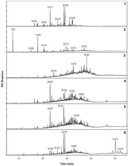 Comparative GC-MS profiles of various samples of C. myrrha. Specimens: (1) #3550, (2) #2092, (3) #5369, (4) #6452, (5) #8549, and (6) #8986.