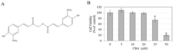 (A) Chemical structure of Calebin-A (CBA), (B) Viability of B16F10 mouse melanoma cells treated with CBA at various concentrations in 0.1% DMSO for 48 h quantitated by MTS assay, #p < 0.01 versus control. Data are average of quadruplicate determinations.