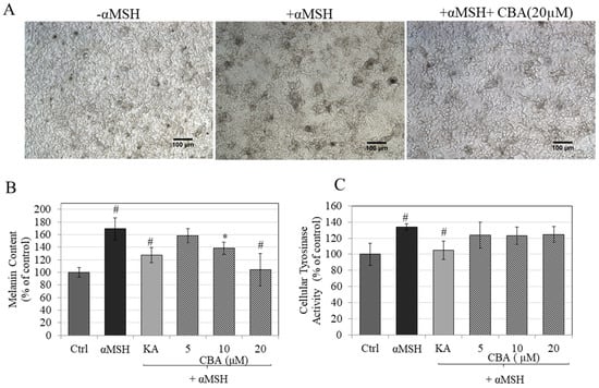 (A) Representative phase-contrast images showing B16F10 cells treated without and with αMSH in the presence of CBA (20µM), scale bar corresponds to 100µm, (B) B16F10 cells treated with CBA at various concentrations in 0.1% DMSO in the presence or absence of αMSH for 48 h quantitated by spectrophotometric method. Kojic acid (KA) was used as a positive control at 500 µM and concentration of αMSH was 150 nM, (C) Cellular tyrosinase activity in B16F10 cell lysates, #p < 0.01 versus control, *p < 0.05 versus control. Data are averaged from at least two independent experiments.