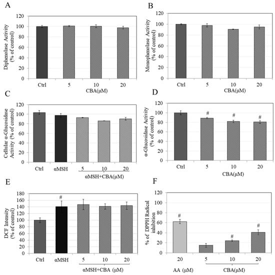 In order to test if CBA may inhibit the α-glucosidase enzyme which regulates the early stage of maturation of tyrosinase enzyme in cells [21,22], lysates of B16F10 cells were assayed for enzyme activity by addition of pNG substrate and the rate of formation of the reaction product p-nitrophenol was monitored at 405 nm in kinetic mode for 30 min at 37 °C in a microplate reader. The relative intracellular α-glucosidase activity was calculated as: (rate of sample reaction/rate of control reaction) × 100%.