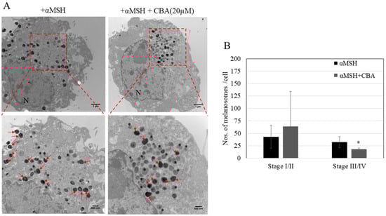 (A) Ultrastructural analysis of melanosomes in B16F10 cells treated with CBA (20 µM) in absence or presence of αMSH, N-nucleus. The red square shows the exploded view at higher magnification, the asterisk (*) symbol denotes immature melanosomes (Stage I/II) and red arrows denote mature melanosomes (Stage III/IV), (B) Quantification of melanosome numbers in different stages. A total of 325 melanosomes for the αMSH group and 287 melanosomes for the MSH + CBA group were counted from 8–10 random electron micrographs. *p < 0.05; student’s t -test with Welch correction.