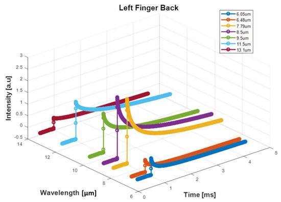 The selection of detection wavelength was achieved by using narrow bandpass infrared interference filters (LaserComponents Ltd, UK), as shown in Figure 1. These narrow bandpass filters have half-peak bandwidths less than 6% of the center of the wavelength value. In this work, we will use seven detection wavelengths, i.e., 13.1 μm, 11.5 μm, 9.5 μm, 8.5 μm, 7.79 μm, 6.48 μm, and 6.05 μm. By selecting the detection at a particular wavelength, it can illuminate the possible interferences of light at other wavelengths, such as the laser light and other infrared or near infrared light.