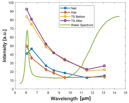 By least squares fitting the OTTER signals at different wavelengths using Equation (1), we can get the OTTER spectra results. Figure 4 shows the spectra results of human nail (index finger nail, left hand), hair, normal finger (back of left hand index finger, middle phalange), as well as finger (back of left hand index finger, middle phalange) after five times of tape stripping, compared with water spectra (not in real scale). From the spectra results we can clearly differentiate different samples and changes in samples. We can clearly see the differences between skin and hair/nail.