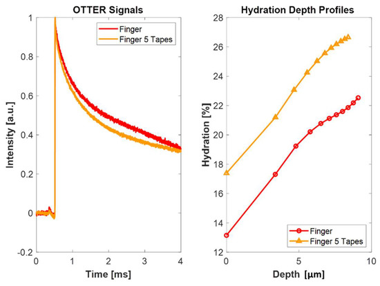 Figure 5 shows OTTER signals at 13.1 μm detection wavelength of the skin sites for normal finger and after five times of tape stripping, as well as the corresponding skin hydration depth profiles calculated by using the enhanced SLS fitting algorithm. The skin site shows higher hydration levels after tape stripping.