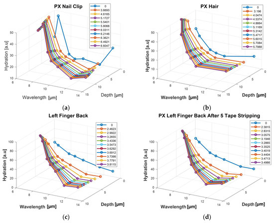 The advantages of the SLS fitting are it is simple and fast in performing the calculation, which is very important for real-life applications. It is also very effective, as our previous studies show that it can effectively differentiate homogenous samples from non-homogenous samples [20]. The skin hydration depth profiles calculated by SLS fitting are generally in agreement with the literature values [26,27].