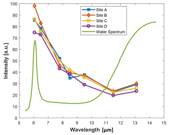 The OTTER spectra result for Site A, Site B, Site C, and Site D, as well the water spectra.
