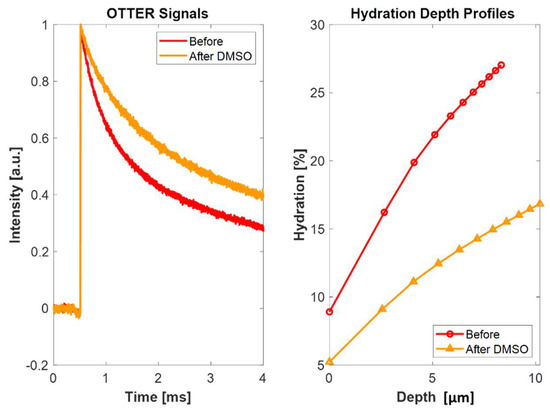 The OTTER signals at 13.1 μm (left) and corresponding depth profiles of Site C before and after a 5 min DMSO application (right).